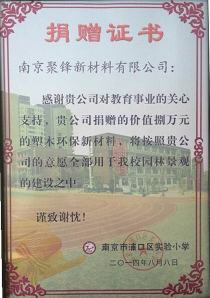 2014年8月8日平博网页版捐赠给南京市浦口区实验小学价值8万元的塑木环保型材料,用于该校区校园环境改造建设。此次捐赠仪式获得了校方的大力支持,校方对我公司这一举措表示了衷心的感谢。这次支持浦口区实验小学单臂廊架工程,我公司从销售部到技术部都参与相关的项目建设。8月6日中午,技术部樊工和销售部小张顶着南京高达38摄氏高温度到施工现场进行指导施工。跟校方现场工程安装人员,耐心地讲解,帮助他们完成了单臂廊架的铺设和150米地面地板的铺设工程。8月8日工程完成当天,校方为了表达对我公司的敬意,特意制作了荣誉证书给我公司以表感谢。