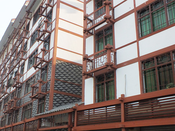 有了塑木的加入,使得原本平庸的建筑顿时鲜活起来,望之使人眼前一亮,待仔细观察后而又发现其独特的韵味。塑木材料的自然感、新中式的设计,以及现代生活中普通的建筑,将这些融合在一起,巧妙的点缀,一点也无冲突感,也没有全仿古建筑的繁琐,整体清新自然。