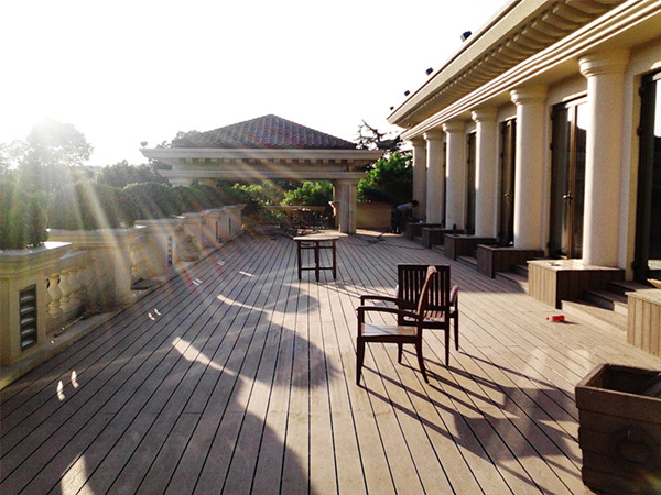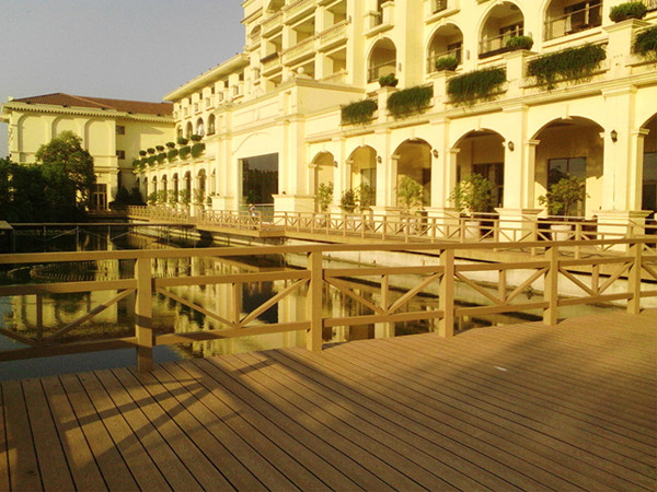 索菲特高尔夫酒店的户外塑木工程,在阳光的照射下有一种华丽、高贵的感觉。