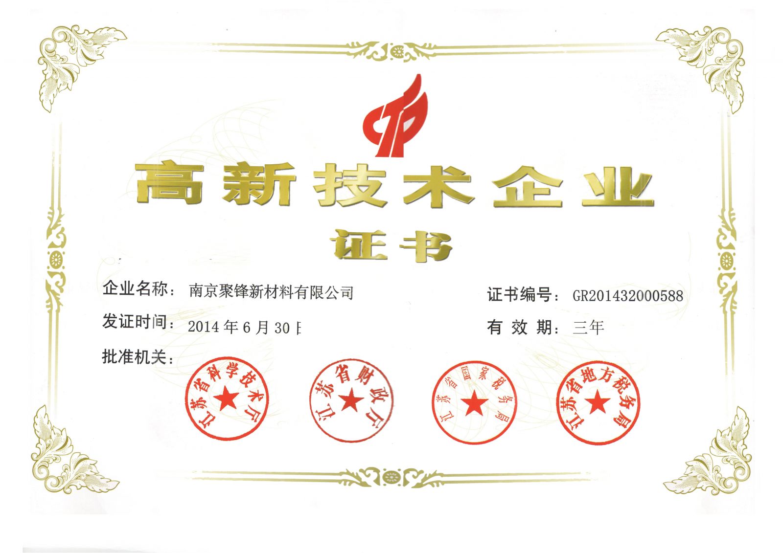根据《高新技术企业认定管理办法》(国科发火[2008]172号)和《高新技术企业认定管理工作指引》(国科发火[2008]362号)有关规定,平博网页版于2014年3月底完成2014年高新技术企业第一批申报工作,经江苏省高新技术企业认定管理工作协调小组专家审定,2014年6月30日公示平博网页版为高新技术企业。