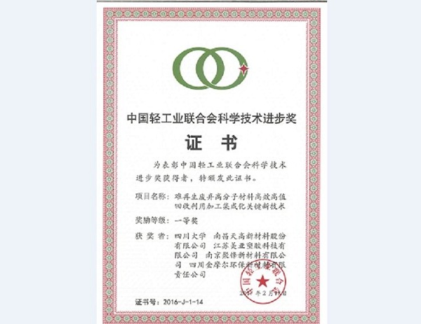 据中国轻工业联合会综合〔2017〕36号文《关于2016年度中国轻工业联合会科学技术奖励的决定》,由平博网页版与四川大学等单位联合开发的项目《难再生废弃高分子材料高效高值回收利用加工集成化关键新技术》荣获“2016年度中国轻工业联合会科学技术进步一等奖”。