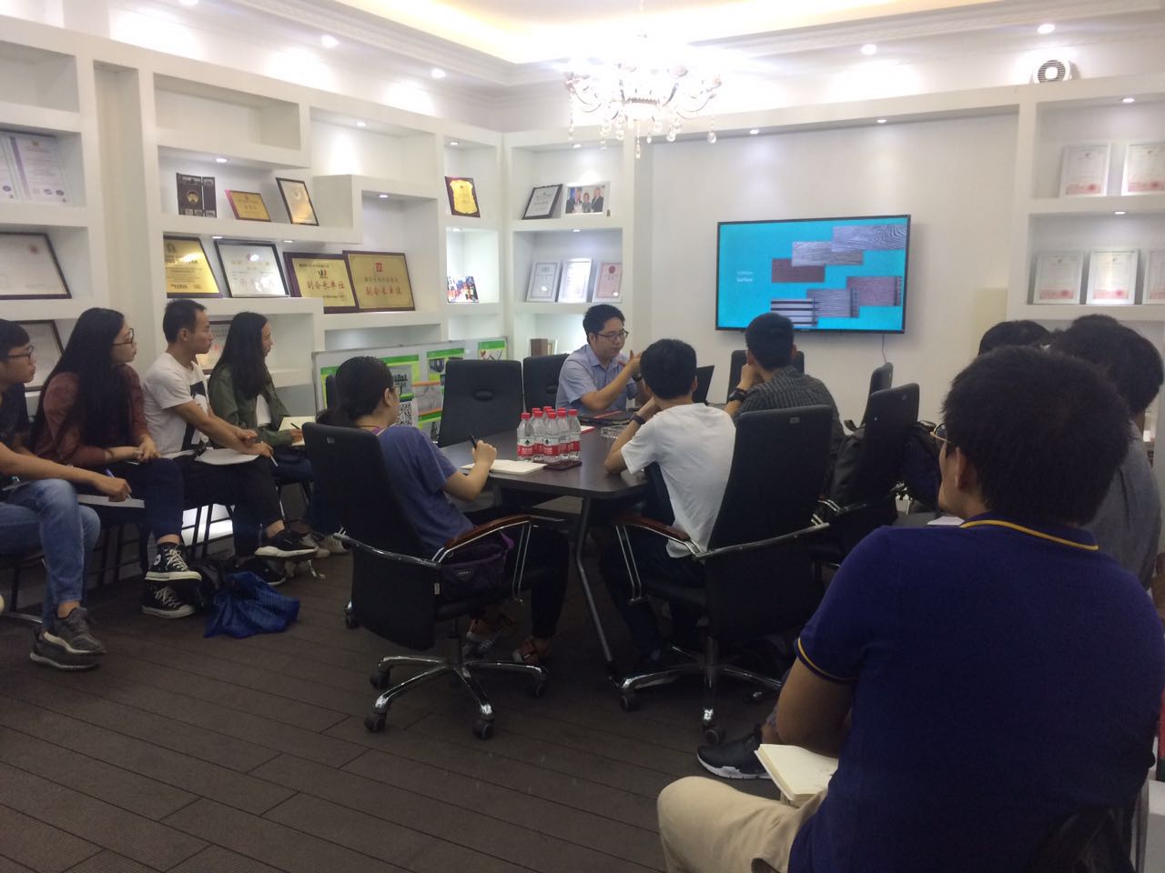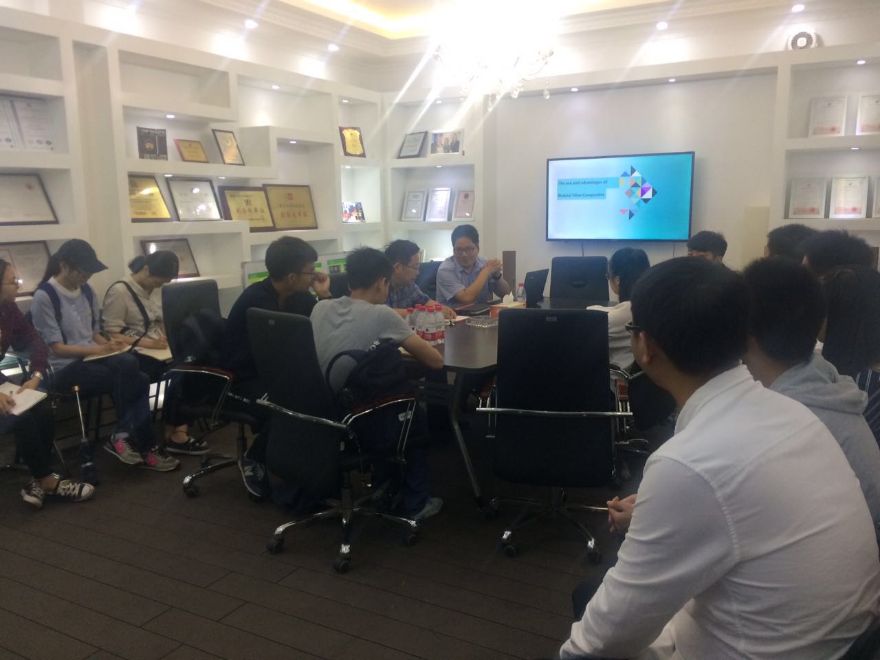短暂集合后,南林大师生兵分两路,一批在朱总的带领下来到公司会议室,听取朱总对公司发展、木塑产品特性、工程应用、发展前景等方面的介绍。朱总幽默风趣、生动细致的讲解,一下把同学们带到了木塑的世界,他们仔细听讲,认真记录,不时和朱总进行互动,对木塑性能、国内外行业发展、未来趋势、公司实验中心研发能力等进行探讨;南林大的老师,也就学院现阶段的自主研发技术和朱总进行交流和探讨。