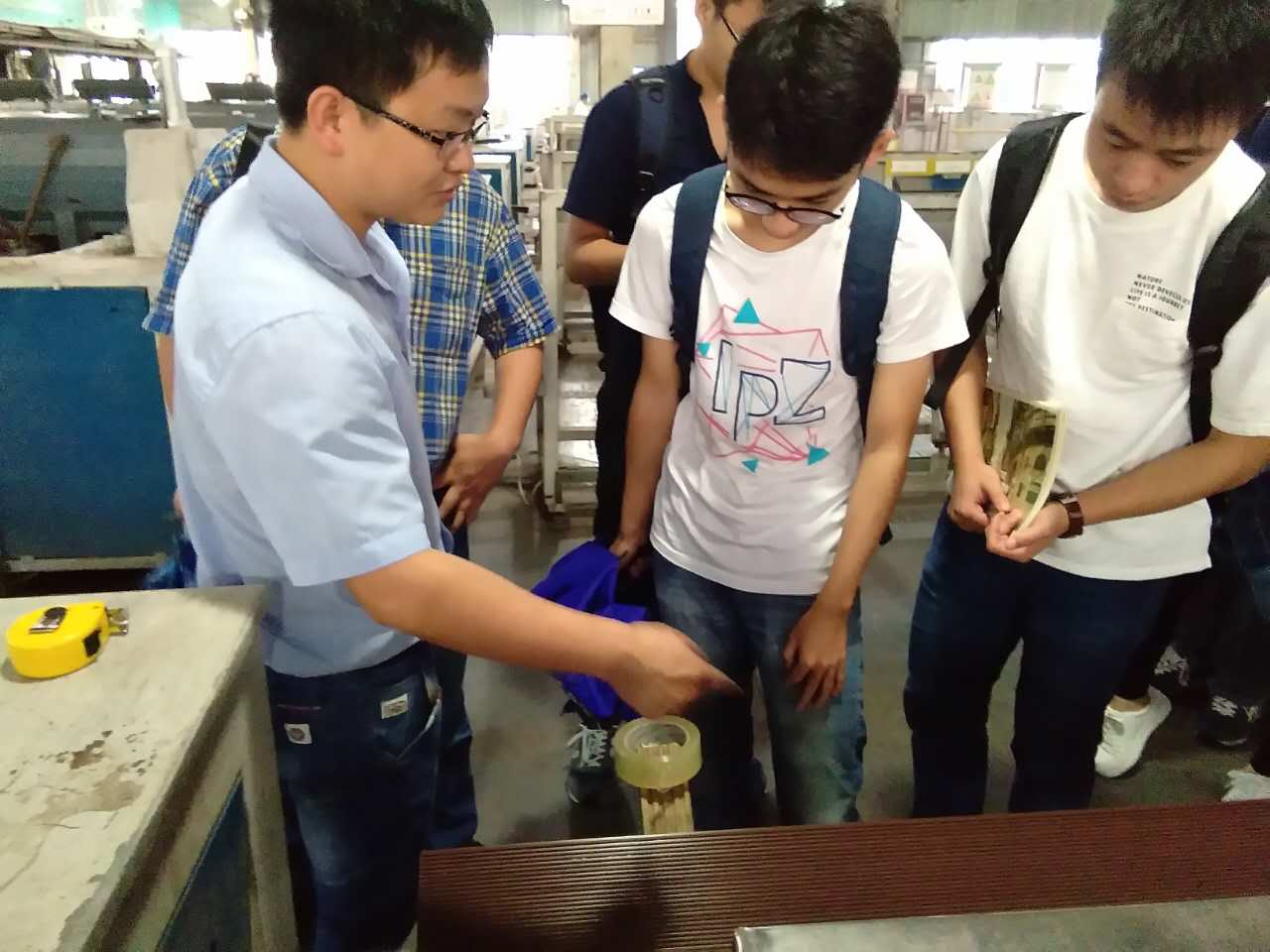 另一批同学在生产部副经理桂佳明的带领下参观生产车间。桂经理简单介绍了木塑产品的主要生产流程,重点参观了挤出车间和后处理车间。在挤出车间,桂经理详细介绍了设备的类型和构造,挤出产品的基本工艺和原理等;在后处理车间,则重点介绍了设备的主要用途及后处理的意义。在参观过程中,同学们不时提出疑问和个人想法,桂经理进行详细解答。参观完毕后,两批同学互换参观场地,分享参观感受。