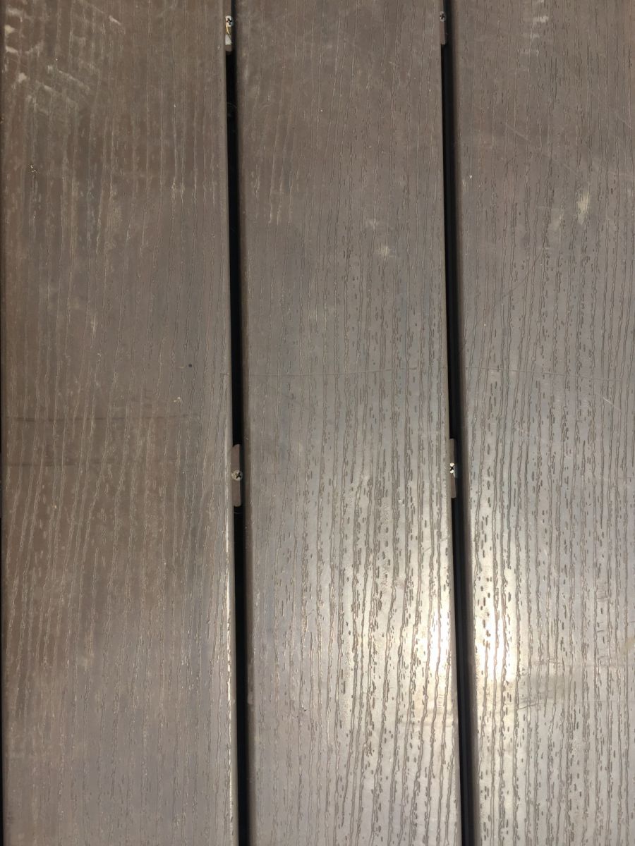一眼看去,我们的塑木地板还像以前一样,没有一点破损。穿着平底鞋走在上面也很舒服,完全没有水泥板或者地砖轻微硌脚的感觉。
