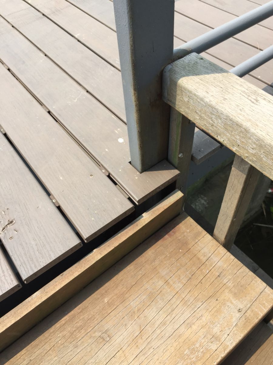 放上一张扶手的照片,这是一种进口的木材,叫印茄,俗称“菠萝格”,可以看出,它也不如我们的塑木材料。