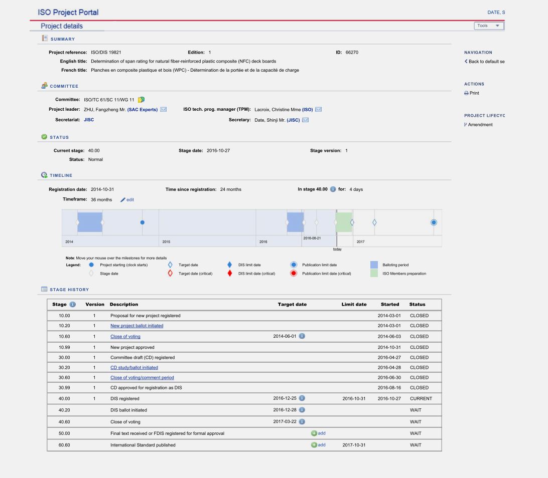 2017年3月,我公司牵头制订的国际标准ISO/DIS 19821《Determination of span rating for natural fiber-reinforced plastic composite (NFC) deck boards》通过ISO TC61/SC11 标委会投票。公司于5月份向ISO TC61/SC11 秘书处提交了FDIS稿件,预计标准将于2017年10月前正式发布。