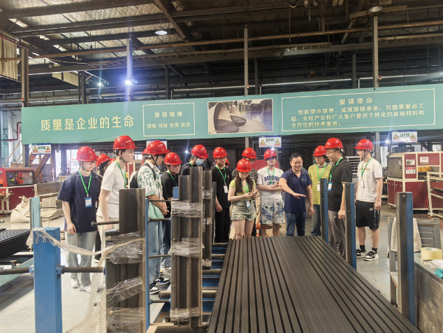 交流活动伊始,在公司会议室举行了座谈交流会,简要介绍了企业的发展历程、核心技术以及主要产品。随后,在负责人的引导下,南林师生们参观了公司的产品展厅和生产车间。师生们走进生产车间,实地观摩了从原材料挤出成型到后期处理的全流程的生产线。师生们对公司产品表现出了浓厚的兴趣,纷纷驻足观察,同时大家也对新型环保材料从研发到规模化生产的转化过程有了直观、深入的认识。